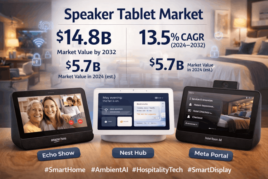 The Speaker Tablet Market — ambient smart display devices combining voice-assistant interfaces with always-on touchscreens — is projected to reach USD 14.8 billion by 2032 (13.5% CAGR). Positioned at the intersection of smart home hubs, digital photo frames, recipe displays, video calling terminals, and AI voice assistants, speaker tablets are expanding from kitchen countertop fixtures into bedroom, living room, and commercial hospitality deployments. Multi-modal interaction — combining voice, touch, and gesture — is driving category expansion across consumer and enterprise channels.