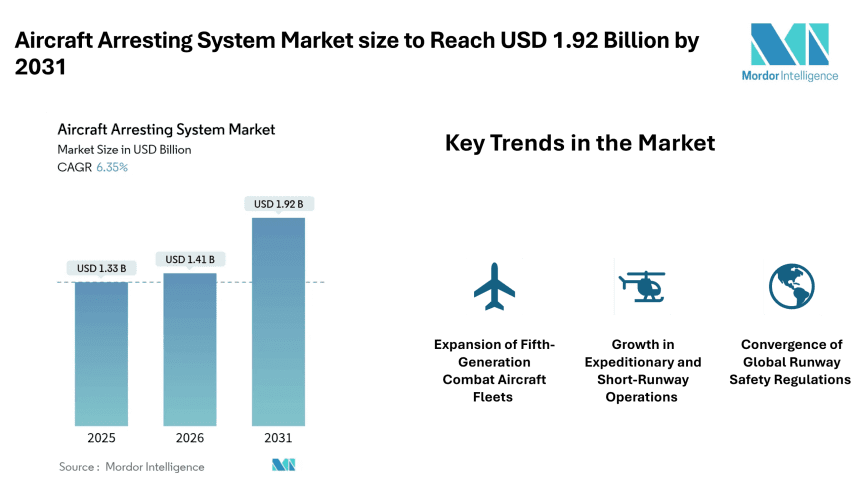 According to Mordor Intelligence, the aircraft arresting system market size was valued at USD 1.41 billion in 2026 and reach USD 1.92 billion by 2031, registering a CAGR of 6.35% during the forecast period. The aircraft arresting system market size is supported by rising investments in advanced fighter aircraft, aircraft carrier modernization programs, and stricter runway safety requirements across commercial airports.