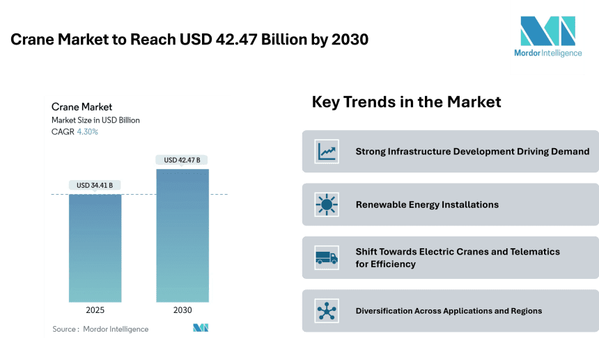 The crane market reached USD 34.41 billion in 2025 and is projected to advance to USD 42.47 billion by 2030, translating into a 4.30% CAGR. This growth is underpinned by a variety of factors, including increased public infrastructure spending, large-scale private megaprojects, and a growing emphasis on renewable energy installations. As the world navigates evolving construction needs and energy transitions, the demand for versatile, high capacity lifting equipment continues to rise.