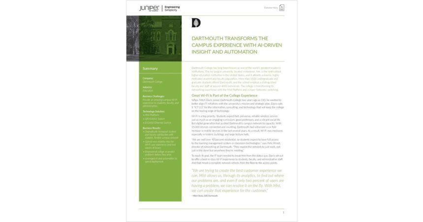 The Ivy League university, located in Hanover, NH, is the ninth oldest higher education institution in the United States, and it attracts a diverse, highly motivated student and faculty population. More than 6500 undergraduate and graduate students attend Dartmouth, and the school employs a distinguished faculty and staff of around 4000 individuals. The college is transforming its networking experience with the Mist Platform and Juniper Networks switching.