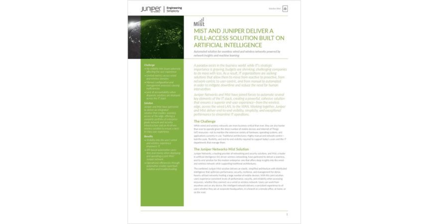 | A paradox exists in the business world: while IT’s strategic importance is growing, budgets are shrinking, challenging companies to do more with less. As a result, IT organizations are seeking solutions that allow them to move from reactive to proactive, from network-centric to user-centric, and from manual to automated in order to mitigate downtime and reduce the need for human intervention. Juniper Networks and Mist have joined forces to automate several key elements of the IT stack, creating a powerful, cohesive solution that ensures a superior end-user experience—from the wireless edge, across the wired LAN, to the WAN. Working together, Juniper and Mist deliver end-to-end visibility, simplicity, and exceptional performance to streamline IT operations. Request Free! |