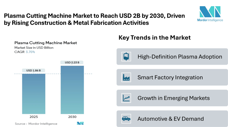 According to Mordor Intelligence, the Plasma Cutting Machine Market size is estimated at USD 1.86 billion in 2025, and is expected to reach USD 2.23 billion by 2030, at a CAGR of 3.70%. This market expansion is primarily fueled by the increasing adoption of automated systems, rising demand from automotive and transportation sectors, and the ongoing shift toward digitalized metal fabrication processes. The Asia-Pacific region currently leads the market in size, while South America is emerging as the fastest-growing region, reflecting strong demand from small and medium-sized enterprises (SMEs) and industrial expansion.