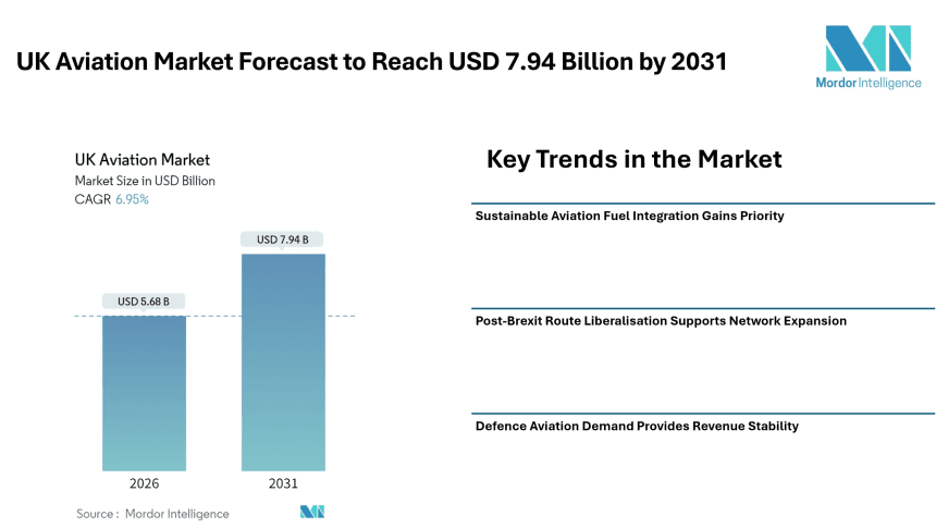 According to Mordor Intelligence, the UK aviation market size was valued at USD 5.68 billion in 2026 to USD 7.94 billion by 2031, reflecting a CAGR of 6.95% during the forecast period. This outlook underlines a balanced recovery supported by civil aviation demand, government defence spending, and policy-driven sustainability goals.